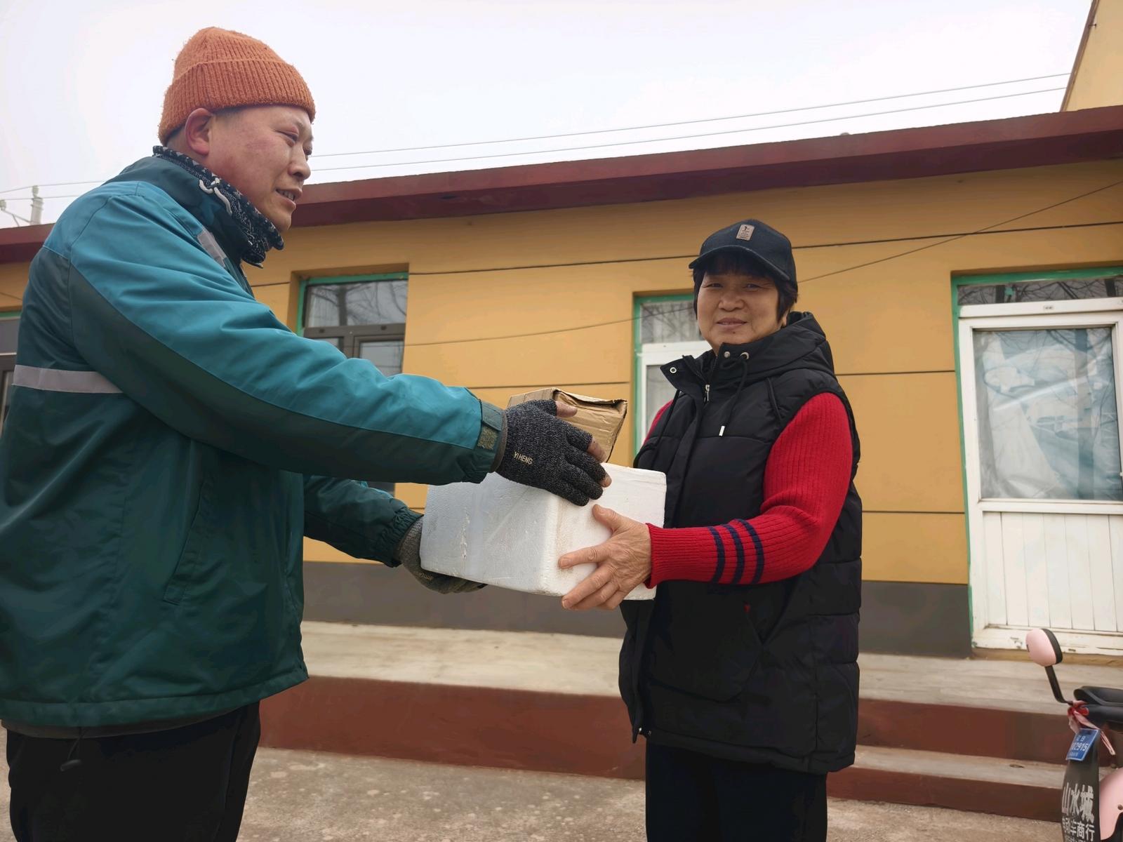 上午9点30分,谭威武把车开进了洪家村一户农户的院子里,听到声音的张璐大姐马上迎了出来。“过年好呀!”交接包裹的那一刻,两个人也送上最美好的新春祝福。开朗热情的张女士告诉记者,她在网上买了一些年货,过年孩子们都回来过年,要多准备几道“硬菜”。